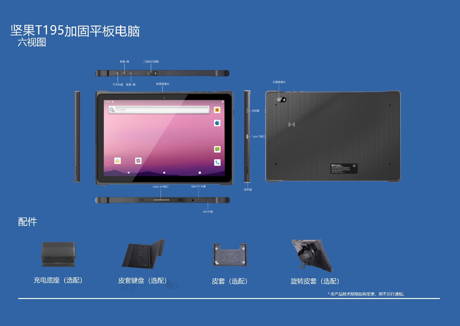 后置1300萬+前置500萬雙攝,超清像素。802.11ac雙頻Wi-Fi,支持AP無縫漫游。GPS/Galileo/GLONASS/BeiDou,多模定位導航。多功能NFC,多協議智能讀卡。綁帶、充電底座、皮套、皮套鍵盤、旋轉皮套,各種配件一樣不少。