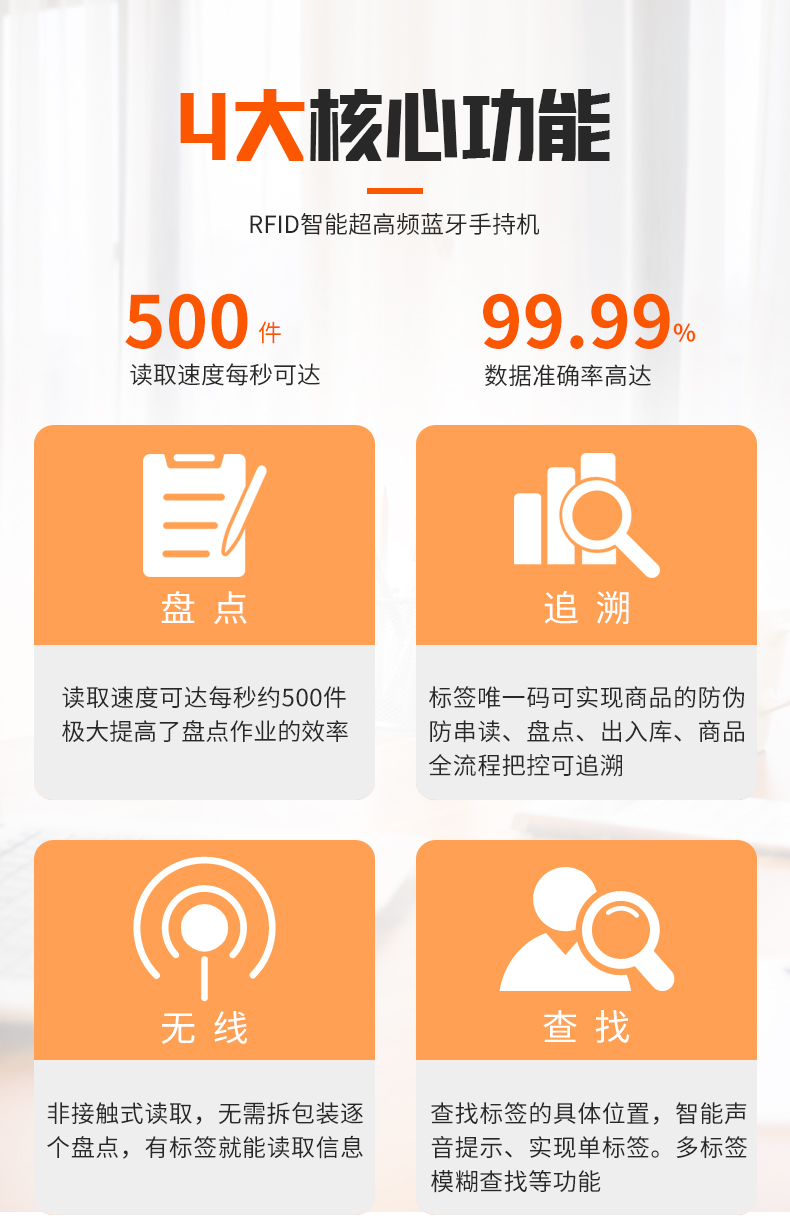 超高頻藍牙盤點儀A100是一款長距離RFID讀寫器,穩定讀寫距離在15米左右,群讀每秒可以讀300個電子標簽。高性能的讀寫能力使其可以應用到任何惡劣的場景,如大型倉庫,物流站點配送,門店盤點以及洗滌行業。