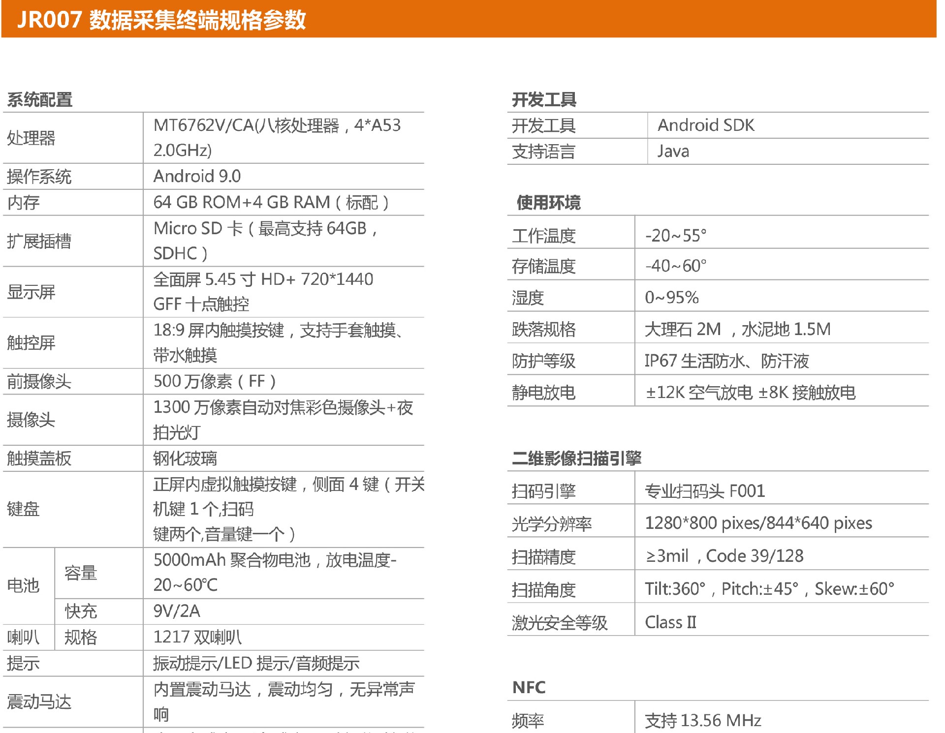 JR007 系列數(shù)據(jù)采集終端能承受 1.5 米高度水泥地的跌落沖擊,2 米大理石的抗摔測(cè)試。IP67 防護(hù)等級(jí),可以 有效抵御粉塵和浸水環(huán)境,設(shè)備精致耐用。